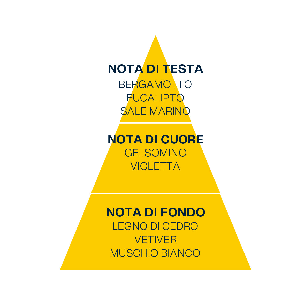 Il compound di testa è fresco e vivace con sentori frizzanti di Bergamotto, Eucalipto e Sale marino che introducono un sofisticato cuore capace di equilibrare le note fiorite di Gelsomino e Violetta con la mineralità dell’accordo ozonato, mentre il fondo di legno di Cedro, Vetiver e Muschio bianco dona un sillage inebriante.