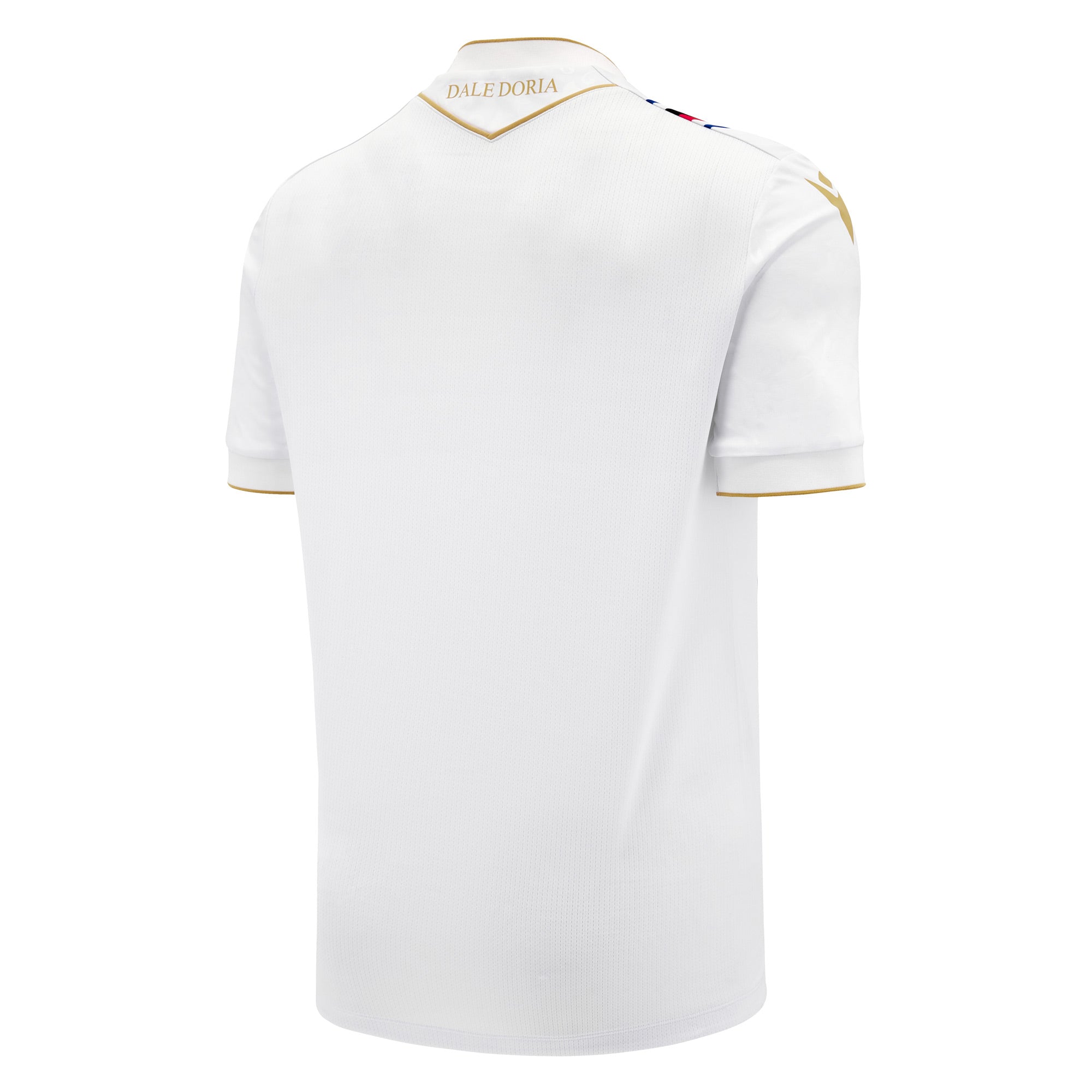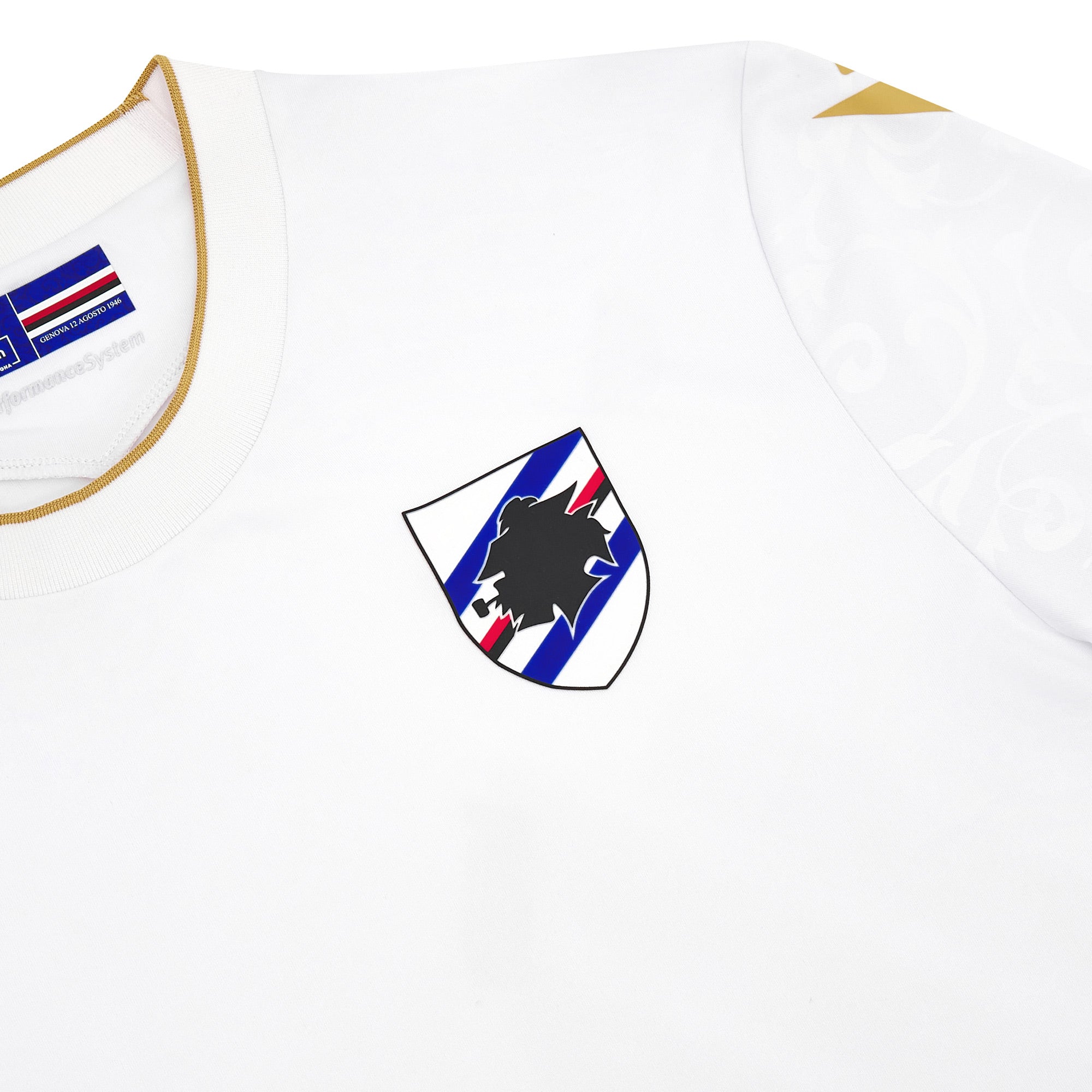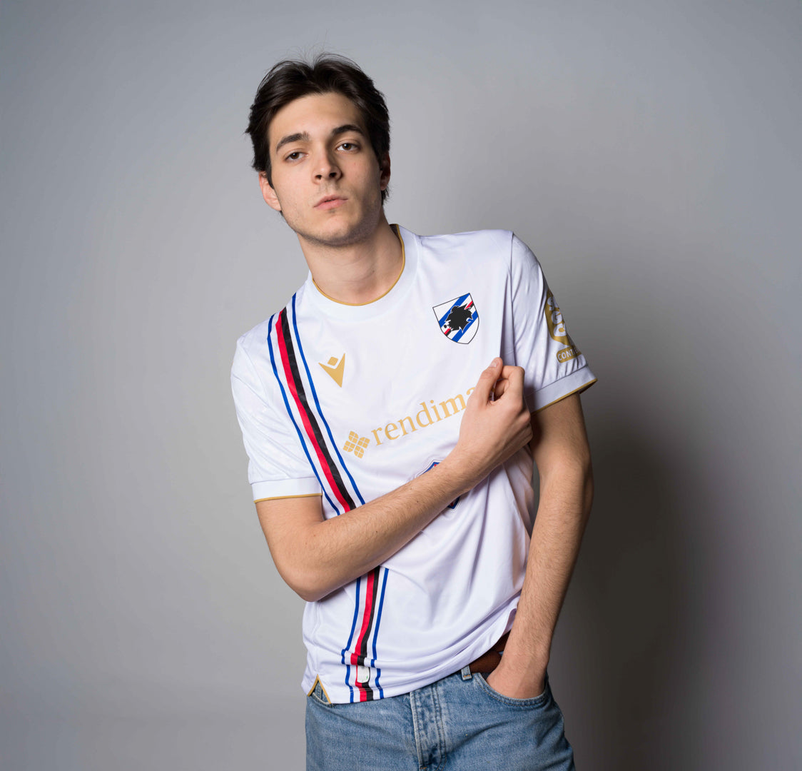 The Sampdoria Away Jersey for the 2024/25 season comes with a white background enriched by an all over embossed pattern inspired by the Renaissance graphics of the Rolli. There are gold inserts, on the back of the neck is the inscription "DALE DORIA". The bluerchiata band crosses the whole right side of the head.